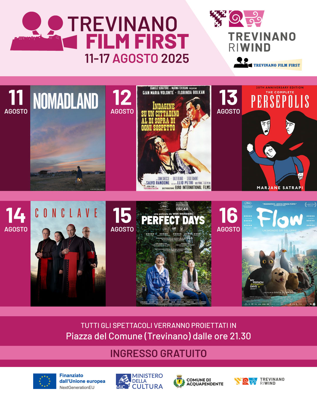 Trevinano Film First non è soltanto un’occasione per scoprire o riscoprire grandi storie sul grande schermo, ma anche un momento di incontro e condivisione per la comunità e per chi sceglierà di vivere Trevinano in queste serate estive. Portate con voi l’entusiasmo, la curiosità e, perché no, una coperta per godervi il cinema sotto il cielo stellato di agosto.